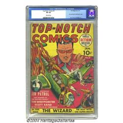 Top-Notch Comics #2 (MLJ, 1940) CGC VF 8.0 Off-white pages. This comic is historically notable for being the first comic to show a Nazi swastika on the cover. It would be just the first of many! While the Wizard is still the headline feature in this comic, Dick Storm and Stacy Knight M.D. join the lineup, beginning their short runs in this title. Jack Cole and Mort Meskin contribute interior artwork. This copy shows no notable defects, just light general wear typical for the grade. Overstreet 2003 VF 8.0 value = $1,494. Important notice: Heritage usually auctions material at the rate of 200-250 lots per hour. On some occasions eBay Live bid software or the Internet may not be able to keep up with the pace of the auction. We recommend placing a realistic absentee bid now as insurance to avoid disappointment. Occasionally the auctioneer may eliminate or reject an eBay Live bid, and the auctioneer may also reopen a lot after the close of the eBay live bidding (usually because we missed an audience bid), and may reject your bid even if it shows you as the winning bidder. By bidding via eBay Live, you agree that Heritage may award the lot to another bidder at its sole discretion under the circumstances described above or any other reasonable circumstances. Since eBay bids are not shown to us until we open the lot on the floor, we treat those bids just like floor bids. In most cases the floor responds before the eBay bid is presented to us, due to Internet lag time, so for consistency we have made it a policy that floor bids are always considered first over tie eBay live bids. Also please note that all Heritage lots purchased through eBay Live carry a 20% Buyer's Premium. Please make sure you read the Terms and Conditions before you bid.