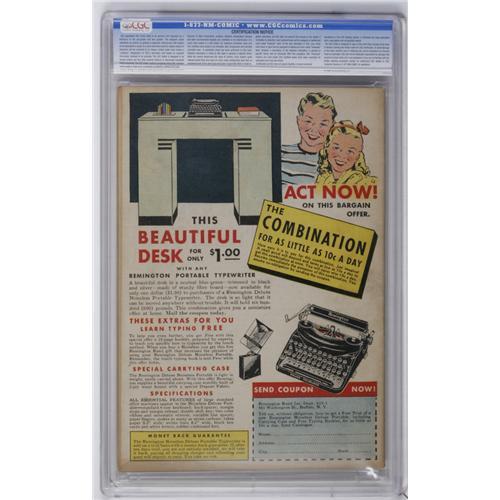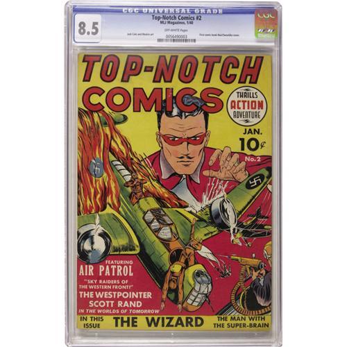 <B>Top-Notch Comics #2 (MLJ, 1940) CGC VF+ 8.5 Off-white pages.</B></I> This second issue beats out all others to claim to be first in showing a Nazi Swastika on its cover, as the Wizard uses his Super-Brain to help down an German Axis warplane. Jack Cole and Mort Meskin are among the artists credited for this issue. Overstreet 2006 VF 8.0 value = $1,538; VF/NM 9.0 value = $2,432. CGC census 10/06: 1 in 8.5, 2 higher.<BR><BR><b>Shipping:</b> Slabbed Comic (<a target="_blank" href="http://www.heritageauctions.com/common/shipping.php">view shipping information</a>)