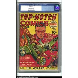 Top-Notch Comics #2 (MLJ, 1940) CGC VF/NM 9.0 Cream to off-white pages. One of the earliest offerings by MLJ, the publisher that would eventually give us Archie and other true funny book characters, this issue also gives us the "First comic book Nazi/Swastika cover", according to CGC's notes. Edd Ashe does the cover honors, while the more famous Jack Cole contributes with a Manhunters story. This is a beautifully preserved copy. Overstreet 2002 NM 9.4 value = $2,600. Important notice: We expect to be auctioning lots at the rate of 200-250 per hour. Sometimes eBay Premier live bid software cannot keep up with that pace, so we strongly recommend that you place a realistic proxy bid now as insurance to avoid disappointment. Also please note that all Heritage/CAA lots purchased through eBay Premier carry a 20% Buyer's Premium.
