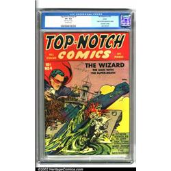 Top-Notch Comics #4 Larson pedigree (MLJ, 1940). In the earliest days of the superhero boom, MLJ was a strong contender, with their offbeat line of costumed crimefighters. This early issue of Top-Notch cover-features the Wizard (the Man with the Super Brain), and also contains the origin and first appearance of Streak Chandler on Mars. Legendary artistic talents like Jack Cole, Mort Meskin, and Irv Novick all contributed to this great issue. This superb copy from the legendary Lamont Larson collection exhibits all the usual qualities of that highly respected pedigree, including the telltale "Larson" scribbled on the cover. The book has razor-sharp corners, superb color, and a fresh, supple quality that marks it as one of the truly great pedigree books. CGC VF+ 8.5 Off-white pages. Overstreet 2001 FN 6.0 value = $395; NM 9.4 value = $1,250.  Important notice: We expect to be auctioning lots at the rate of 200-250 per hour. Sometimes eBay Premier live bid software cannot keep up with that pace, so we strongly recommend that you place a realistic proxy bid now as insurance to avoid disappointment. Also please note that all Heritage/CAA lots purchased through eBay Premier carry a 20% Buyer's Premium.