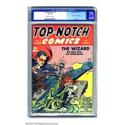 Top-Notch Comics #4 (MLJ, 1940) CGC VF- 7.5 Off-white to white pages. Streak Chandler on Mars makes his first appearance in this classic Golden Age book from MLJ. Jack Cole contributed some of his fantastic artwork as well, and Moore of the Mounted makes his only appearance. This is an extremely beautiful book that is now over 60 years old. Overstreet 2002 VF 8.0 value = $825. Important notice: We expect to be auctioning lots at the rate of 200-250 per hour. Sometimes eBay Premier live bid software cannot keep up with that pace, so we strongly recommend that you place a realistic proxy bid now as insurance to avoid disappointment. Also please note that all Heritage/CAA lots purchased through eBay Premier carry a 20% Buyer's Premium. Please make sure you read the Terms and Conditions.