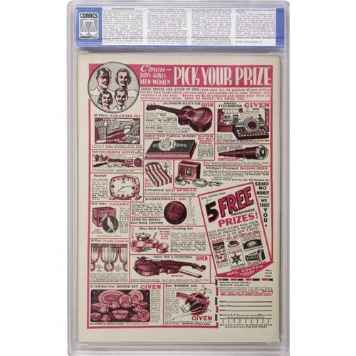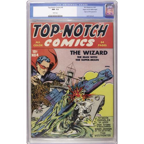 <B>Top-Notch Comics #4 Mile High pedigree (MLJ, 1940) CGC NM- 9.2 White pages.</B></I> An early MLJ in this kind of shape is a welcome sight, and the appearance of a German U-Boat and a sub is interesting considering the April 1940 cover date. This issue's cover, credited to artist Edd Ashe, features the Wizard. Filling out the roster of heroes are Bob Phantom, Dick Storm, and Streak Chandler, it's the latter's first (and fifth-to-last) appearance. This is the only copy certified with a grade above 8.5 by CGC to date. Overstreet 2006 NM- 9.2 value = $2,025. CGC census 10/06: 1 in 9.2, none higher.<BR><BR><b>Shipping:</b> Slabbed Comic (<a target="_blank" href="http://www.heritageauctions.com/common/shipping.php">view shipping information</a>)