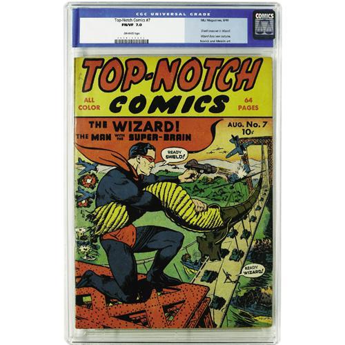 <B>Top-Notch Comics #7 (MLJ, 1940) CGC FN/VF 7.0 Off-white pages.</B></I> The Wizard and the Shield were pretty tight -- not only did they co-star in <B>Shield-Wizard Comics</B></I>, they even crossed over into each others' stories for a while -- heck, even their sidekicks teamed up to form the Boy Buddies! If you squint, you'll even see the Shield on this cover by Edd Ashe. Also of note is that the Wizard got a new costume in this issue. The interior art is by Ashe, Irv Novick, and Mort Meskin. Overstreet 2006 FN 6.0 value = $396; VF 8.0 value = $825. CGC census 3/06: 1 in 7.0, 3 higher.