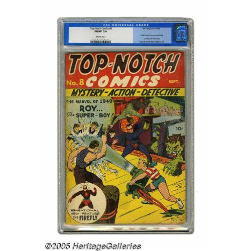 <B>Top-Notch Comics #8 (MLJ, 1940) CGC FN/VF 7.0 Off-white pages.</B></I> Here's the origin and first appearance of Roy the Super-Boy. The Wizard and the Firefly also appear. The most notable artist is Mort Meskin, who drew the story starring adventurer Dick Storm. Overstreet 2005 FN 6.0 value = $450; VF 8.0 value = $938. CGC census 5/05: 1 in 7.0, 2 higher. <BR><BR><B>Important notice:</B> Heritage usually auctions material at the rate of 200-250 lots per hour. On some occasions eBay Live bid software or the Internet may not be able to keep up with the pace of the auction. We recommend placing a realistic absentee bid now as insurance to avoid disappointment. Occasionally the auctioneer may eliminate or reject an eBay Live bid, and the auctioneer may also reopen a lot after the close of the eBay live bidding (usually because we missed an audience bid), and may reject your bid even if it shows you as the winning bidder. By bidding via eBay Live, you agree that Heritage may award the lot to another bidder at its sole discretion under the circumstances described above or any other reasonable circumstances. Since eBay bids are not shown to us until we open the lot on the floor, we treat those bids just like floor bids. In most cases the floor responds before the eBay bid is presented to us, due to Internet lag time, so for consistency we have made it a policy that floor bids are always considered first over tie eBay live bids. Also please note that all Heritage lots purchased through eBay Live carry a 20% Buyer's Premium. Please make sure you read the Terms and Conditions before you bid. This lot is being auctioned in conjunction with a live floor auction by Heritage Galleries & Auctioneers. All final auction and invoice information will be supplied by Heritage Galleries & Auctioneers, and all other information should be considered preliminary. Lot:2510 <BR><BR><B>Winning Notification and Billing:</B> After the FINAL session in this auction is complete, Heritage will s