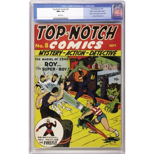 <B>Top-Notch Comics #8 Mile High pedigree (MLJ, 1940) CGC NM+ 9.6 White pages.</B></I> One of the very first comic book sidekicks, Roy the Super Boy, made his first appearance in this issue. Overstreet speculates that Roy might be the second costumed boy hero in comics (trailing only Robin). Roy's origin is in this issue, and so are the origin and first appearance of Firefly, who was a regular in this title over the next couple of years. The issue's cover is by Edd Ashe; the interior artists include Mort Meskin. Overstreet 2006 NM- 9.2 value = $2,025. CGC census 10/06: 1 in 9.6, none higher.<BR><BR><b>Shipping:</b> Slabbed Comic (<a target="_blank" href="http://www.heritageauctions.com/common/shipping.php">view shipping information</a>)