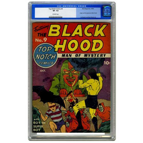 <B>Top-Notch Comics #9 (MLJ, 1940) CGC VF- 7.5 Off-white pages.</B></I> This comic featured the origin and first appearance of the Black Hood. And he gets a hand from the Wizard's sidekick Roy the Super-Boy on the cover. The book's artists include Irv Novick. Overstreet and Gerber both assign their "scarce" rating to this issue. Overstreet 2006 VF 8.0 value = $3,731. CGC census 3/06: 2 in 7.5, 3 higher.