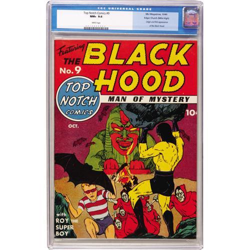 <B>Top-Notch Comics #9 Mile High pedigree (MLJ, 1940) CGC NM+ 9.6 White pages.</B></I> MLJ was the publisher that became Archie, and this comic featured the origin and first appearance of one of its more prominent superheroes, the Black Hood. MLJ obviously expected big things from him, as he's billed above the actual title of the book! Youngster Roy the Super Boy, also seen on the cover, is actually the sidekick of this issue's other top hero, the Wizard. The book also includes art by Irv Novick. Overstreet and Gerber both assigned their "scarce" rating to this issue. Overstreet 2006 NM- 9.2 value = $8,800. CGC census 3/07: 1 in 9.6, none higher.<BR><BR><b>Shipping:</b> Slabbed Comic (<a target="_blank" href="http://www.heritageauctions.com/common/shipping.php">view shipping information</a>)