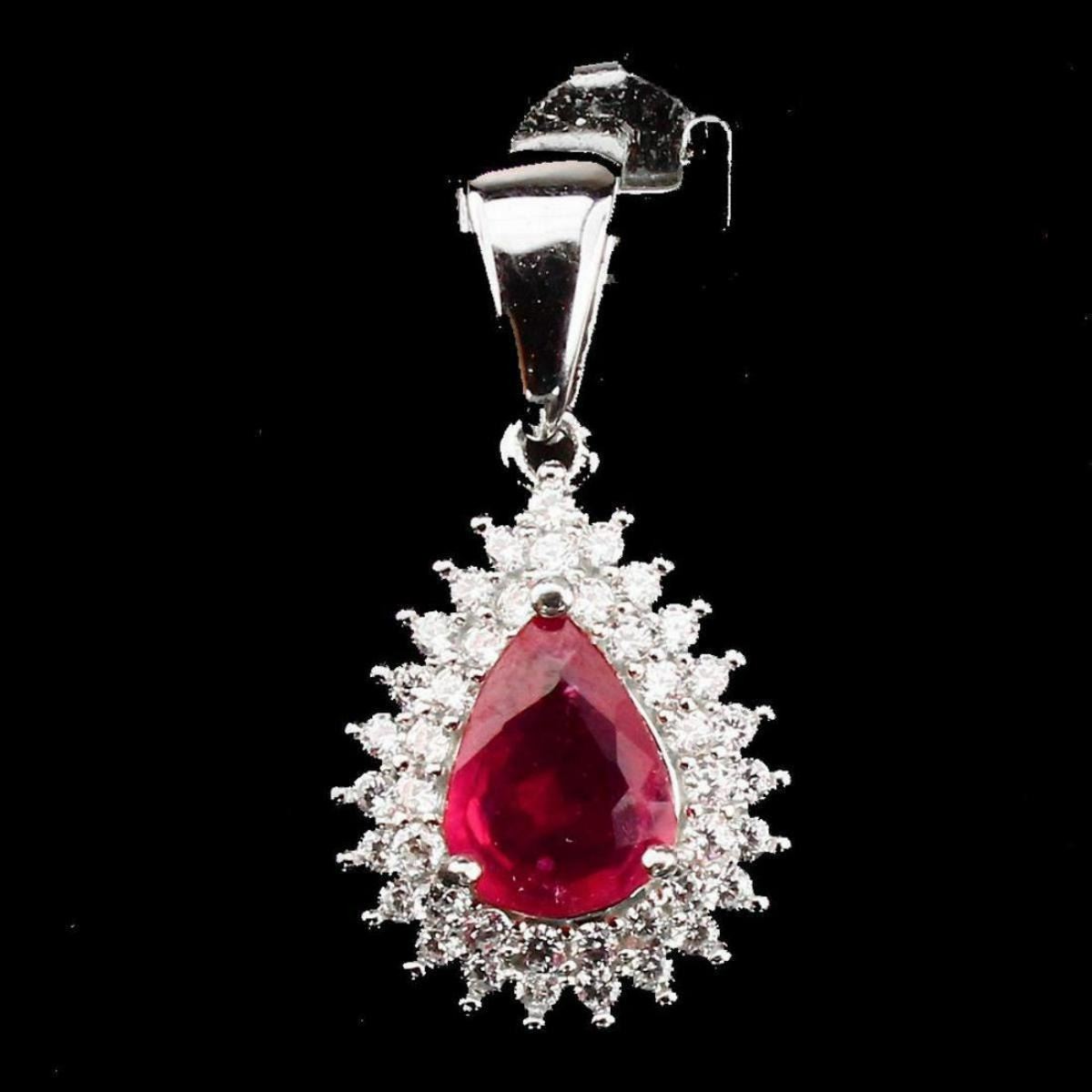 925 STERLING SILVER PLATE 14K WHITE GOLD RING SIZE/LENGTH (INCHES) MAIN STONE RUBY OTHER GEMS CUBIC ZIRCONIA TOTAL WEIGHT 8.54 CT (TOTAL WEIGHT OF SILVER + STONE) DIMENSION * STONE 8.0 X 6.0 MM. * CZ 1.0 MM. * FACE PENDANT 22.0 X 12.0 MM. MAIN STONE SHAPE PEAR CUT MAIN STONE COLOR TOP RICH RED PINK CLARITY/GRADE TRANSPARENT LUSTER RAVISHING TREATMENT- Yes; ORIGIN MOZAMBIQUE HARDNESS 9.0
