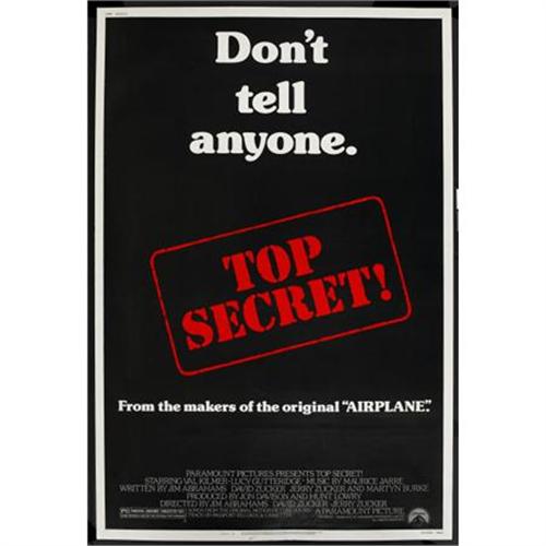 <B>Top Secret! (Paramount, 1984).</B></I> Poster (40" X 60"). Action. Starring Val Kilmer, Lucy Gutteridge, Christopher Villiers and Omar Sharif. Directed by Jim Abrahams, Jerry Zucker and David Zucker. Light wrinkling and edge wear. Minor corner bumps and creases. Rolled, Very Fine+. <BR><BR><b>Shipping:</b> Rolled Material (<a target="_blank" href="http://www.heritageauctions.com/common/shipping.php">view shipping information</a>)
