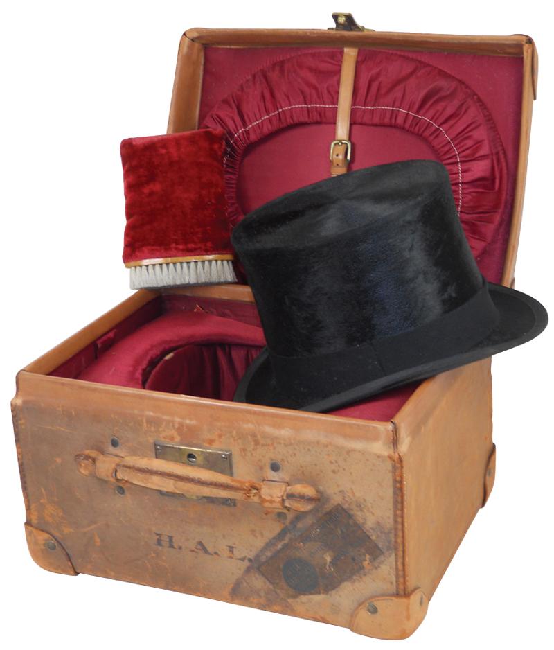 Top hat in fitted leather case, mfgd by Henry, Heath, London, black beaver, size 7 1/2, fitted leather case has Wells Fargo Express label from Pasadena, CA & is initialed H.A.L., burgundy satin lined w/2 accessory boxes & orig horsehair/velvet brush, a high-quality ensemble fit for royalty, all in VG orig cond, case is 9"H x 16.5"W.