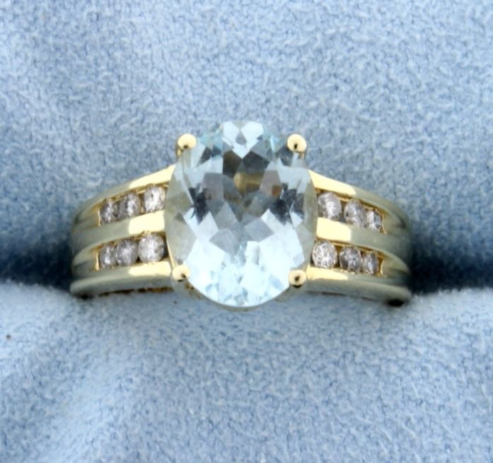 Topaz and diamond ring in 14k yellow gold. Center topaz is 10x8 oval, approximately 3 CT TW with 12 diamonds, approximately .16ct TW. Size 5.5, 4.4g