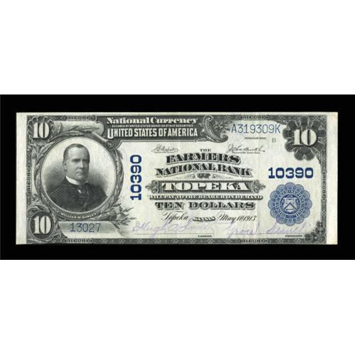 <B>Topeka, KS</B></I> - $10 1902 Plain Back Fr. 630 <B>The Farmers NB</B></I> Ch. # 10390<BR> A scarce state capital issue, with the population in large size just a dozen pieces. This example is as nice as any. <B>Very Fine-Extremely Fine, </B></I>with clear purple signatures.<BR><BR><b>Shipping:</b> Coins & Currency (<a target="_blank" href="http://www.heritageauctions.com/common/shipping.php">view shipping information</a>)
