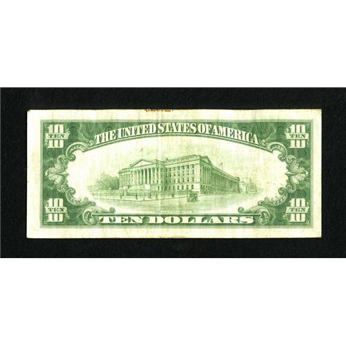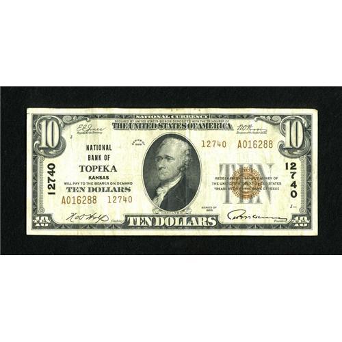 <B>Topeka, KS</B></I> - $10 1929 Ty. 2 <B>NB of Topeka</B></I> Ch. # 12740<BR>A small touch of rust is noticed along the top margin on the back of this bright and crisp note. <B>Very Fine.</B></I><BR><BR><b>Shipping:</b> Coins & Currency (<a target="_blank" href="http://www.heritageauctions.com/common/shipping.php">view shipping information</a>)