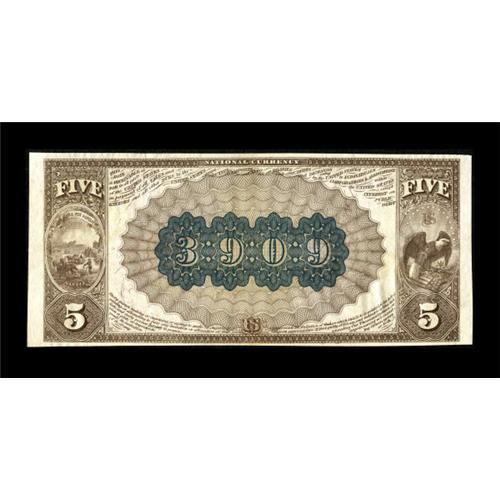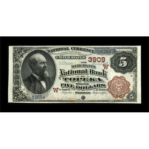 <B>Topeka, KS</B></I> - $5 1882 Brown Back Fr. 470 <B>The Merchants NB</B></I> Ch. # (W)3909<BR> A lovely high grade $5 Brown Back with a neat layout and great eye appeal. It bears about as good a Kansas pedigree as one could ask for, having been part of the C. Dale Lyon holdings from its purchase by him at the 1974 Miami ANA to the time it sold back in 1995. <B>Choice About Uncirculated.</B></I><BR><I>From The J.S. Weber Collection.</B></I><BR><BR><b>Shipping:</b> Coins & Currency (<a target="_blank" href="http://www.heritageauctions.com/common/shipping.php">view shipping information</a>)