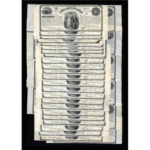 <B>Topeka, KS- Union Military Scrip</B></I> $1 Whitfield 421 June 1, 1867 Thirty-three Examples<BR>Grades range from <B>Fine to About Uncirculated</B></I> on this second grouping of $1 notes. All notes are punch cancelled and have the usual small internal apertures. The occasional note will also have an ink stain. The $1 notes were consecutively numbered on a sheet of four with plate letters A, B, C, and D.