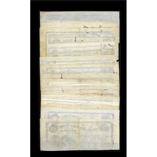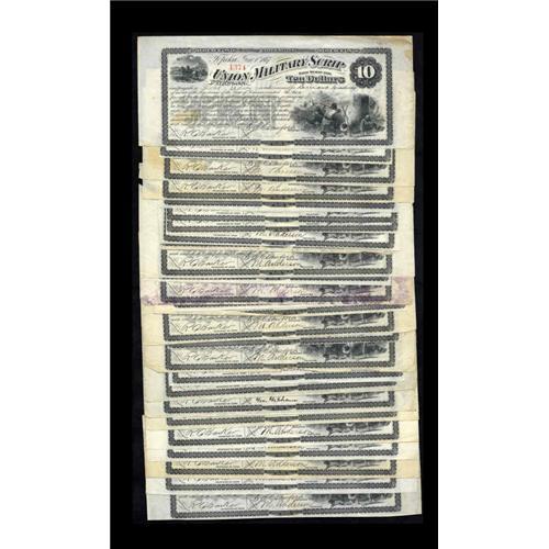 <B>Topeka, KS- Union Military Scrip</B></I> $10 Whitfield 423 June 1, 1867 Twenty-six Examples<BR>Grades range from <B>Fine to About Uncirculated</B></I> on this $10 grouping that is punch cancelled and also has the usual small internal apertures. The occasional note will also have a stain. Some notes are closely trimmed to the frame line, while others sport a large amount of selvedge. Tens and higher denominations were printed one to a sheet by the Continental Bank Note Co. and therefore plate letters were not used.