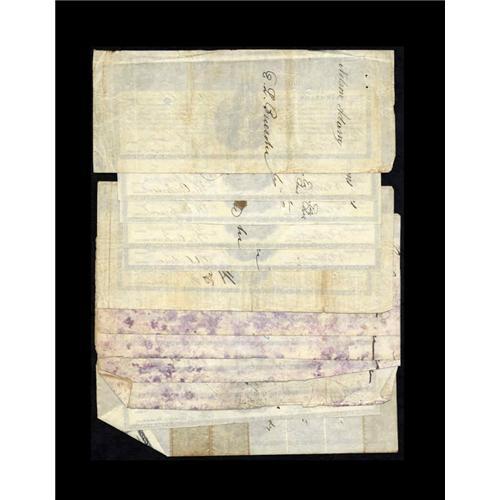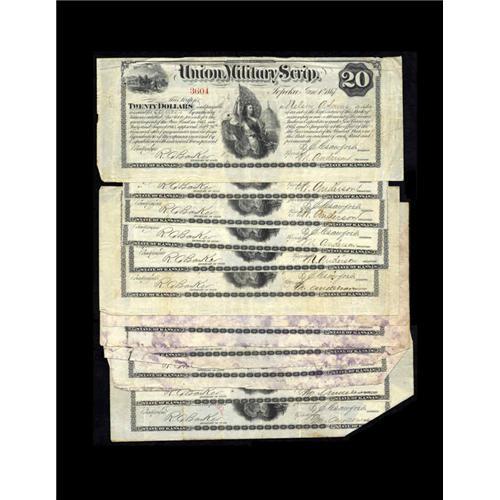 <B>Topeka, KS- Union Military Scrip</B></I> $20 Whitfield 424 June 1, 1867 Twelve Examples<BR>Grades range from <B>Fine to About Uncirculated</B></I> on this $20 grouping. All notes are punch cancelled and have the usual small internal apertures. About a third of the notes have purple ink stains. This lot is split almost half and half whether a note carries a tight margin or a large amount of selvedge.