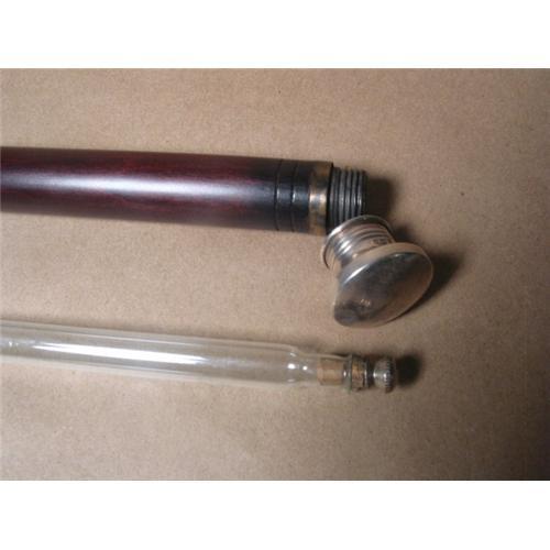 Toper's Cane containing hand blown glass whiskey vial with sterling cap. Knob is silver plate.