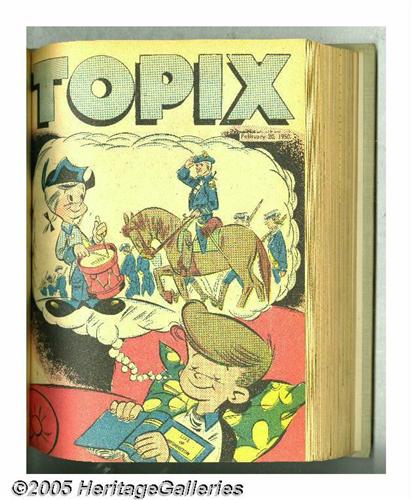 <B>Topix V8#1-30 Bound Volume (Catechetical Guild, 1949-50) Condition: Average VG.</B></I> This set of weekly comics prepared for Catholic children includes a real classic among educational comics -- V8#4's <B>Dagwood Splits the Atom</B></I>, by Joe Musial. Issue #12 contains Graham Ingels art. All issues featured newsprint covers; all were Western Publishing file copies that were bound and trimmed into hardback book editions for office reference use. Approximate Overstreet VG 4.0 value for group = $475. <I>From the Random House Archives.</B></I>