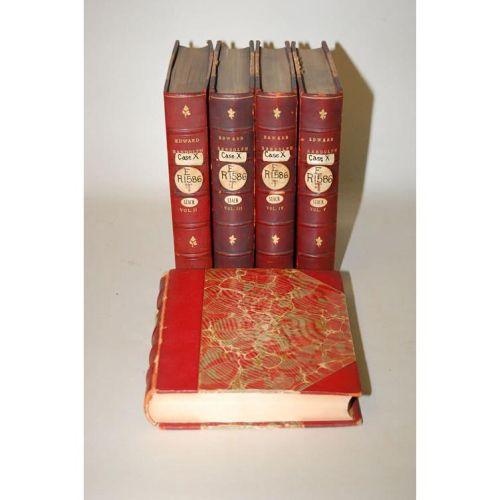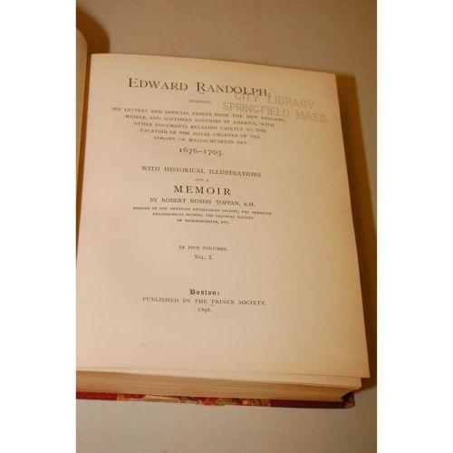 Toppan, Robert Noxon [memoir by]. Edward Randolph; Including His Letters and Official Papers From the New England, Middle and Southern Colonies in America, With Other Documents Relating Chiefly to the Vacating of the Royal Charter of the Colony of Massachusetts Bay. 1676-1703. 5 Volumes. Boston: The Prince Society, 8vo - over 7¾" - 9¾" tall. Hard Cover. Ex-Library. Good Condition. 1898-1899. With historical illustrations and a memoir by Toppan. Complete in 5 Volumes. Bound in 3/4 leather & marbled paper, raised bands on spines, marbled endpapers. LIMITED TO 250 COPIES. Covers detached on volume I, otherwise bindings & hinges tight. Covers show corner wear, some wear to upper/lower edges of backstrips. No library pockets.