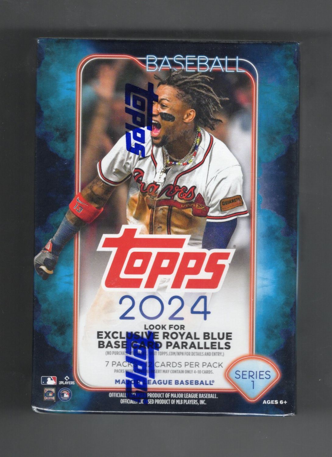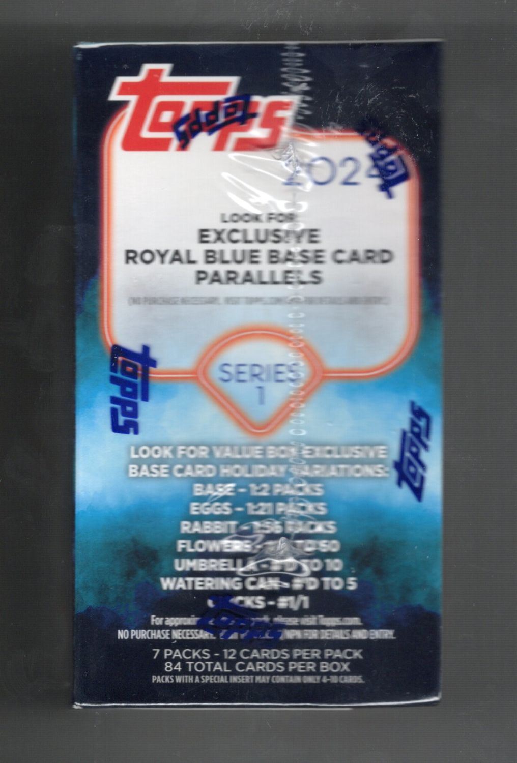 Topps Series 1 2024 Baseball Blaster Box: Look for Exclusive royal blue base card parallels, 12 Cards per pack & 7 Packs per box = 84 Cards!!