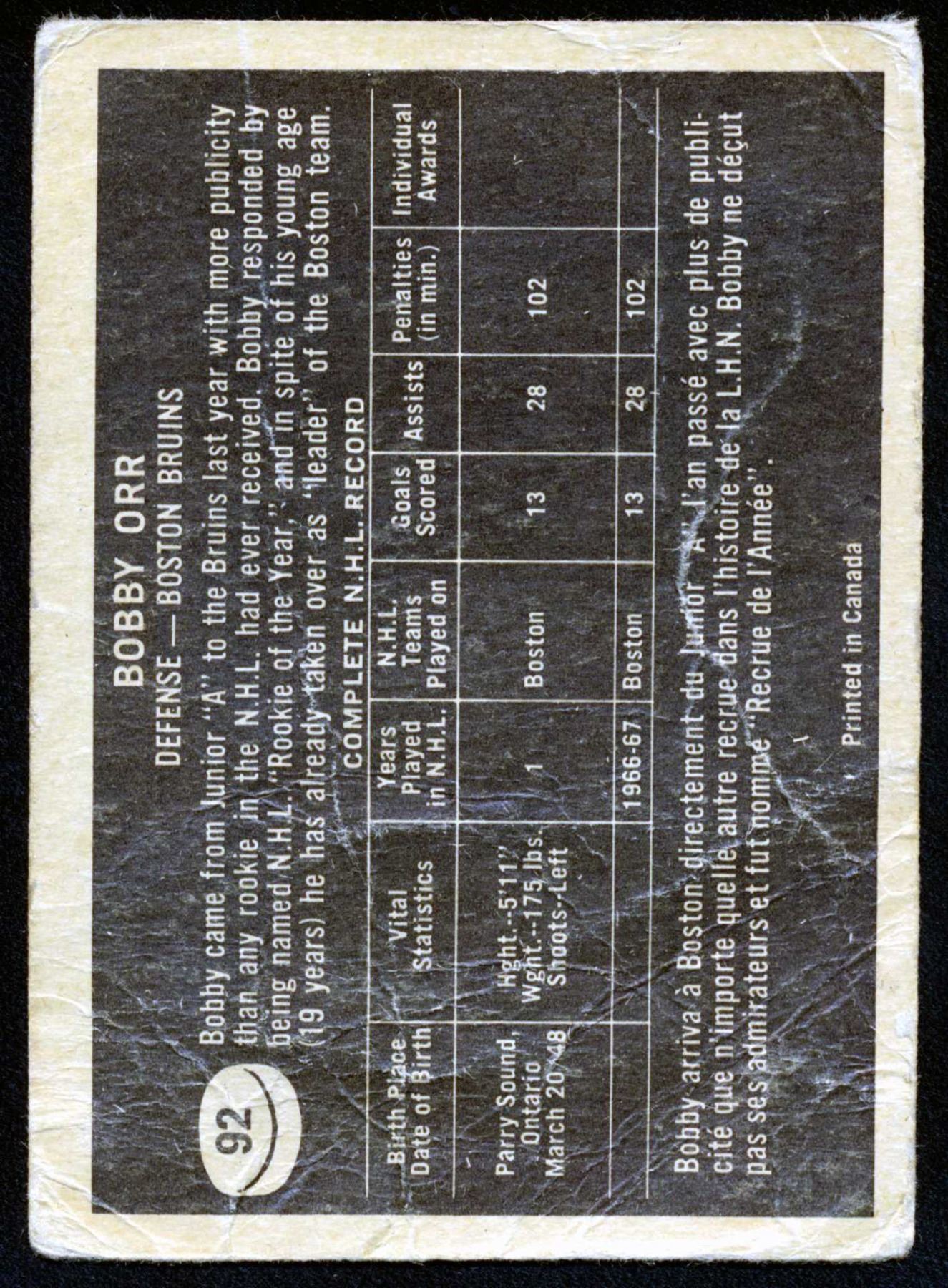 Topps card from Bobby Orr #4 (1967-68) Card #92.