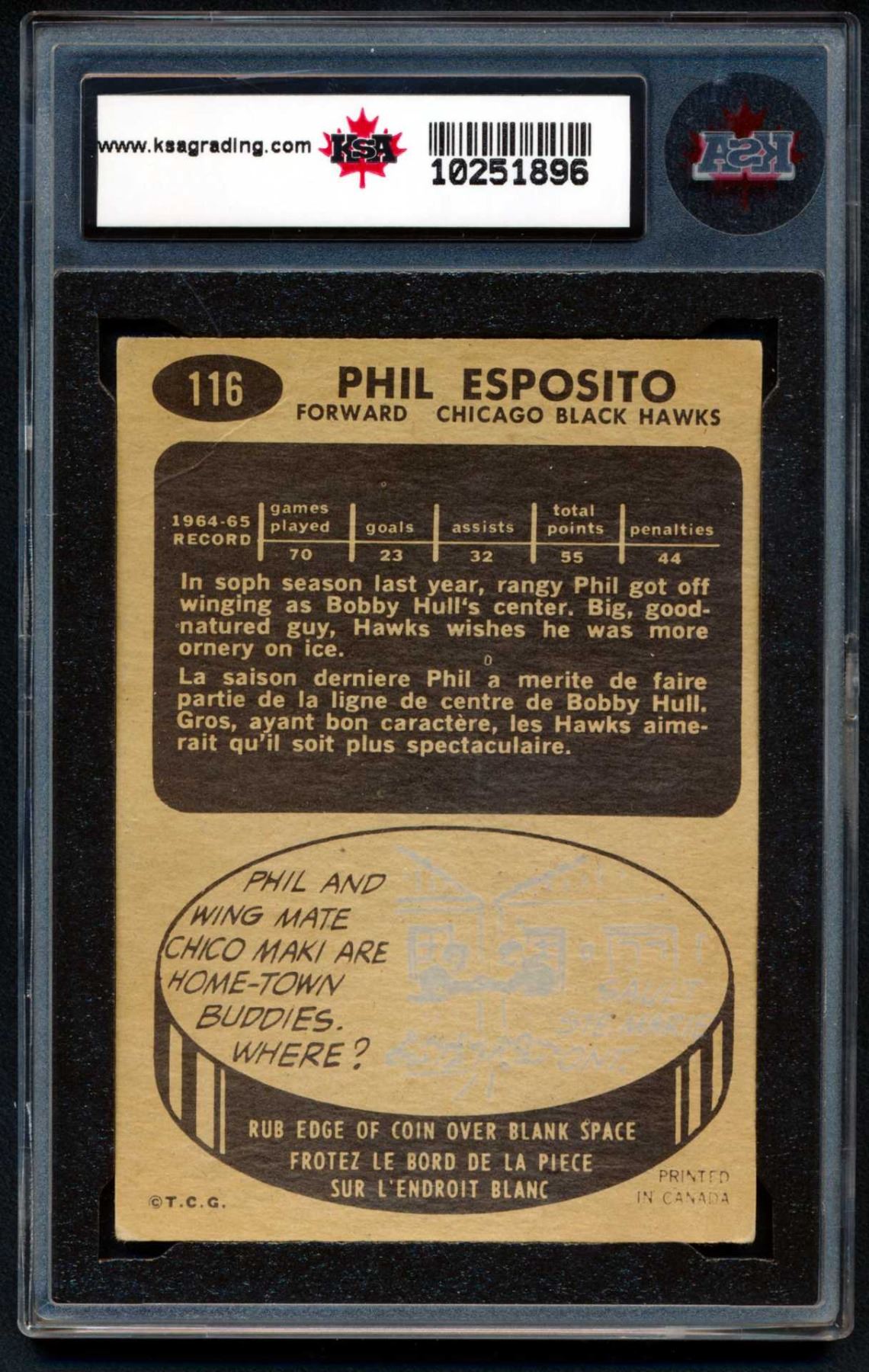 Phil Esposito forward of the Chicago Black Hawks, card #116 of the Topps Company of (1965-66) graded by KSA 4 VGE # 10251896.