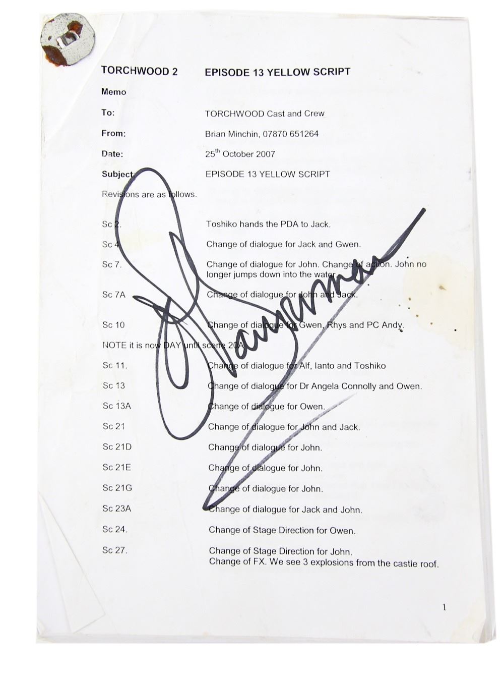 Torchwood 2 Episode 13 Production script from 2007, signed on the front by John Barrowman, Episode 6