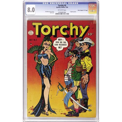<B>Torchy #5 Davis Crippen ("D" Copy) pedigree (Quality, 1950) CGC VF 8.0 Off-white pages.</B></I> This cover is by the artist most associated with Torchy, namely Bill Ward! The issue has interior art by Ward and Gill Fox. Overstreet 2006 VF 8.0 value = $625. CGC census 7/06: 2 in 8.0, 5 higher. <I>From the Crippen Collection.</B></I> <BR><BR><B>Important notice:</B> Heritage usually auctions material at the rate of 200-250 lots per hour. On some occasions eBay Live bid software or the Internet may not be able to keep up with the pace of the auction. We recommend placing a realistic absentee bid now as insurance to avoid disappointment. Occasionally the auctioneer may eliminate or reject an eBay Live bid, and the auctioneer may also reopen a lot after the close of the eBay live bidding (usually because we missed an audience bid), and may reject your bid even if it shows you as the winning bidder. By bidding via eBay Live, you agree that Heritage may award the lot to another bidder at its sole discretion under the circumstances described above or any other reasonable circumstances. Since eBay bids are not shown to us until we open the lot on the floor, we treat those bids just like floor bids. In most cases the floor responds before the eBay bid is presented to us, due to Internet lag time, so for consistency we have made it a policy that floor bids are always considered first over tie eBay live bids. Also please note that all Heritage lots purchased through eBay Live carry a 22.5% Buyer's Premium. Please make sure you read the Terms and Conditions before you bid. This lot is being auctioned in conjunction with a live floor auction by Heritage Auction Galleries. All final auction and invoice information will be supplied by Heritage Auction Galleries, and all other information should be considered preliminary. Lot:41001 <BR><BR><B>Winning Notification and Billing:</B> After the FINAL session in this auction is complete, Heritage will send e-mail and snail mail invoices. This process normally takes several days. All final auction and invoice information will be supplied by Heritage Auction Galleries, and all other information should be considered preliminary. <BR><BR>This auction will be conducted on a live auction floor and over the Internet through eBay Live. If you choose to place an absentee bid, please take a moment to <font color='#0000ff'><u><a href='http://pages.ebay.com/liveauctions/help/before/laabsentee.html'>learn how eBay Live absentee bidding works</a></u></font><font color='#000000'>