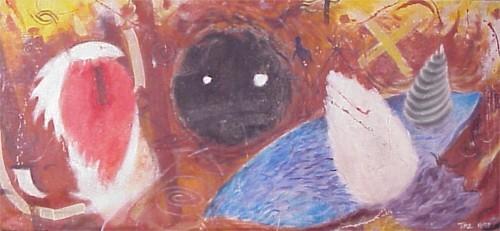 Tore Djupedal (20th Century) BEYOND THE BLACK HOLE, 1987, oil painting on burlap, 42 x 90", signed and dated lower right, loosely stretched.