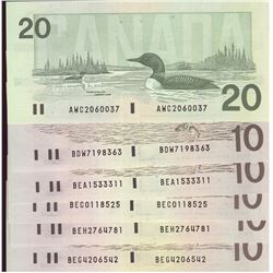 1967+ Banknote Lot; includes 1967 $1 BC-45bA #*NO, *BM, BC-45a(4), BC-45b(5), 1973 $1(5), 1974 $2(3), 1986 $2(5), 1986 $5(2), 1989 $10(3), 1991 $20(4
