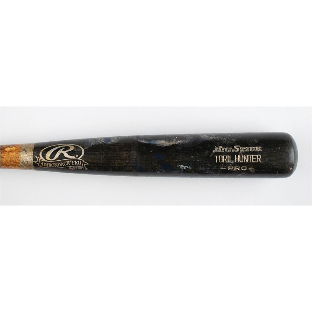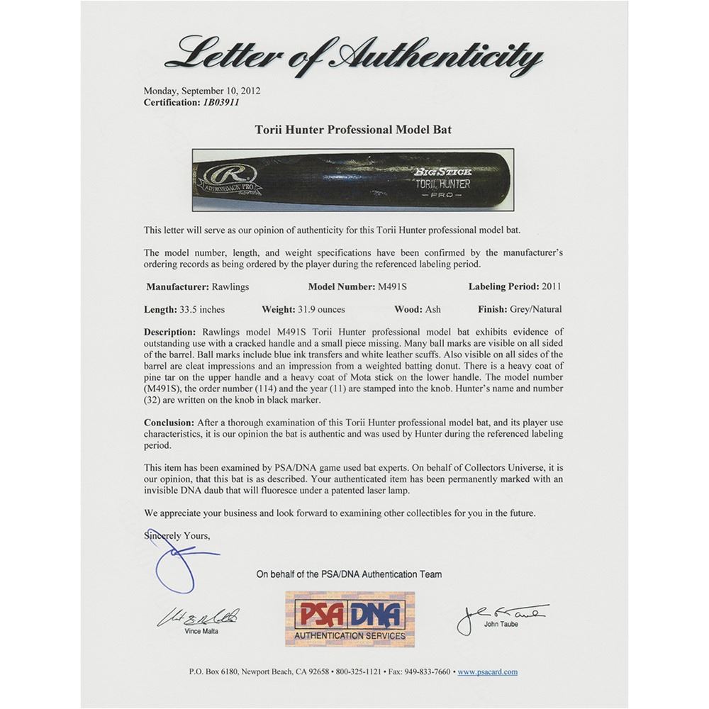Torii Hunter's game-used circa 2011 Rawlings Adirondack Pro Big Stick M491S personal model baseball bat, with his name engraved on the barrel. The gray-and-natural ash bat measures 33.5Ë long, weighs 31.9 ounces, and has his name and number written on the knob in black felt tip: "32, Hunter." The order number ("114") and year ("11") are also stamped into the knob. It exhibits evidence of outstanding use with a cracked handle, heavy coat of pine tar, and Mota stick, and many ball marks and blue ink transfer on the barrel. Accompanied by a letter of authenticity from PSA/DNA. One of the most consistent ballplayers of his generation, Hunter's 2011 campaign with the Angels saw him hit .262 with 23 homers and 82 RBI at age 35.