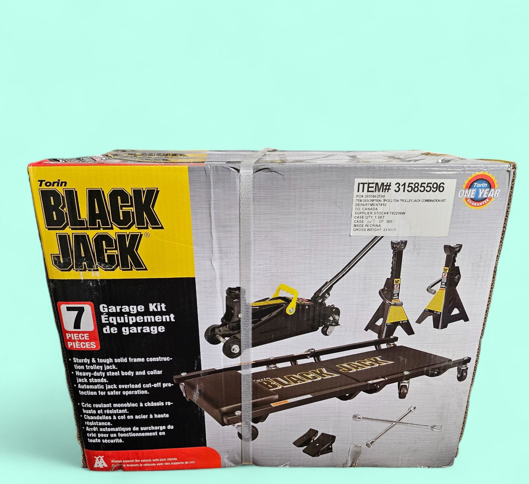 Torin blackjack. 7-piece garage equipment kit. jack stands Jack wheel chocks creeper dolly and lug nut wrench.