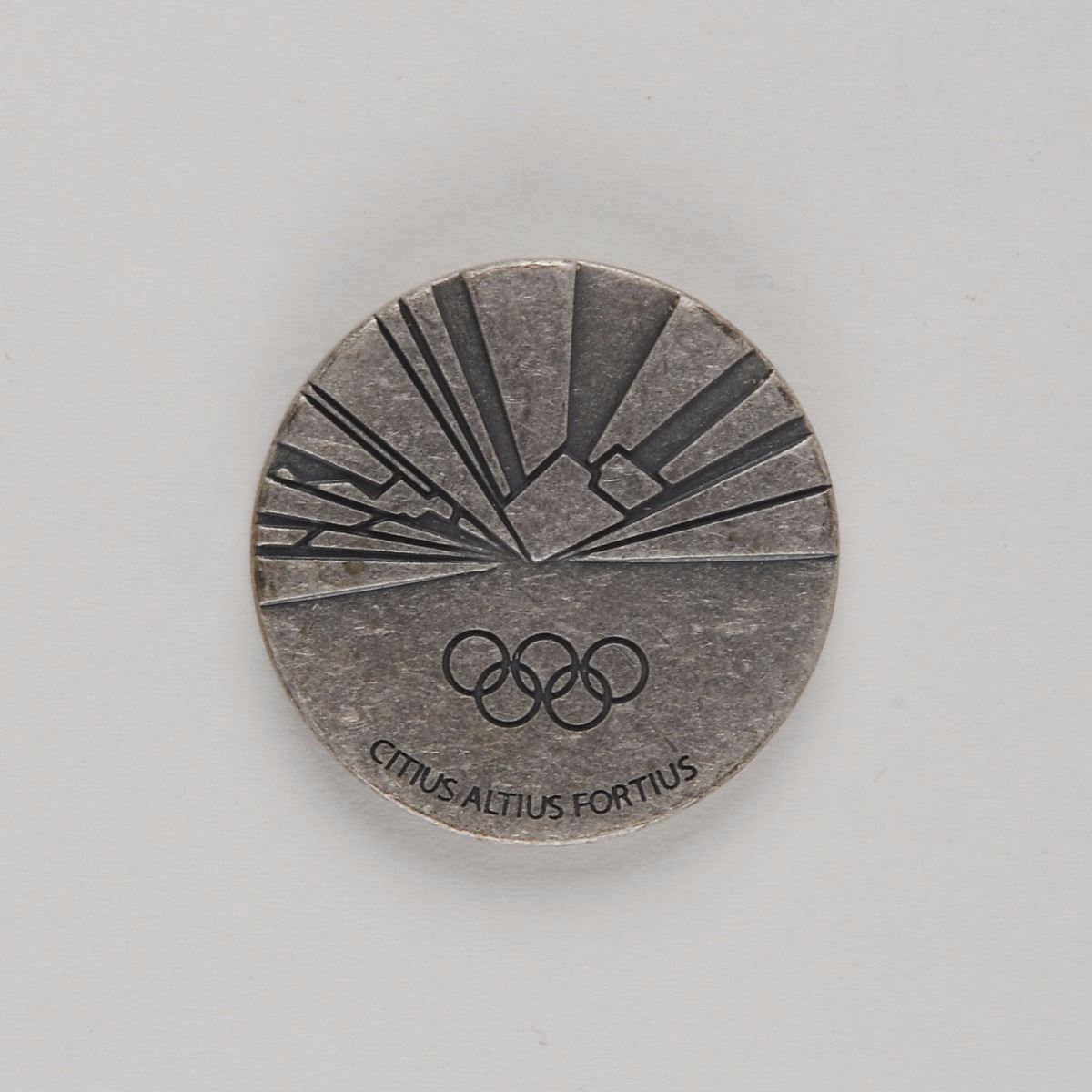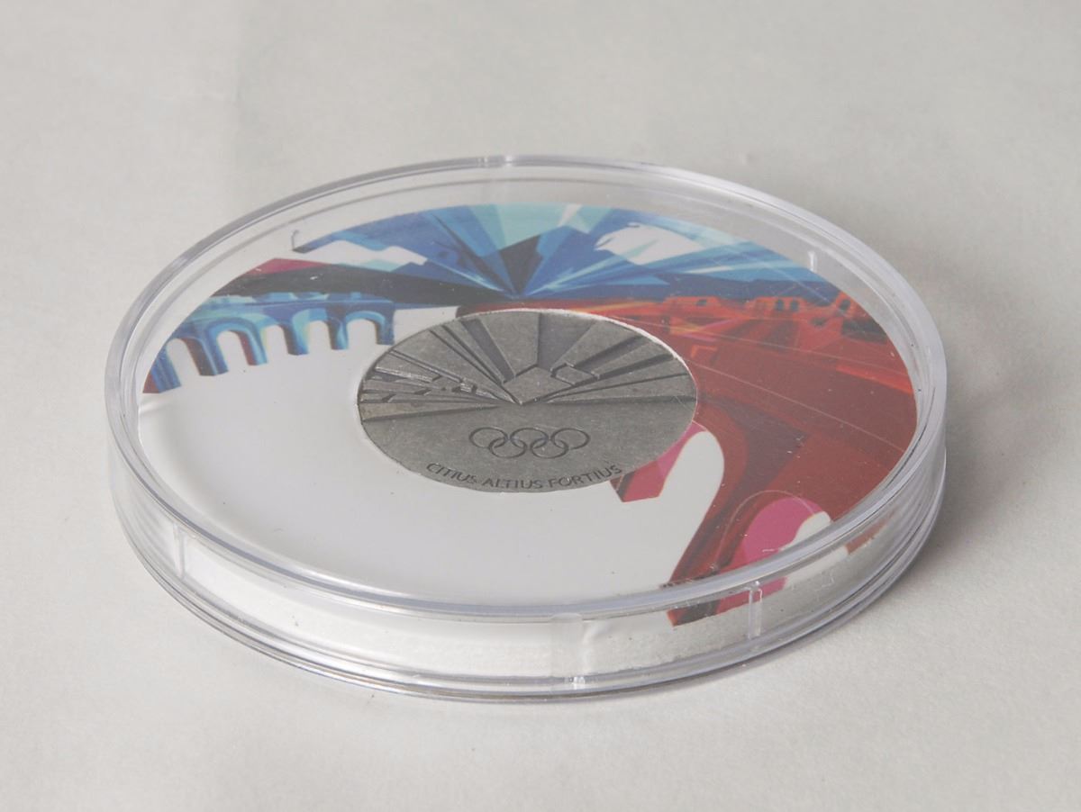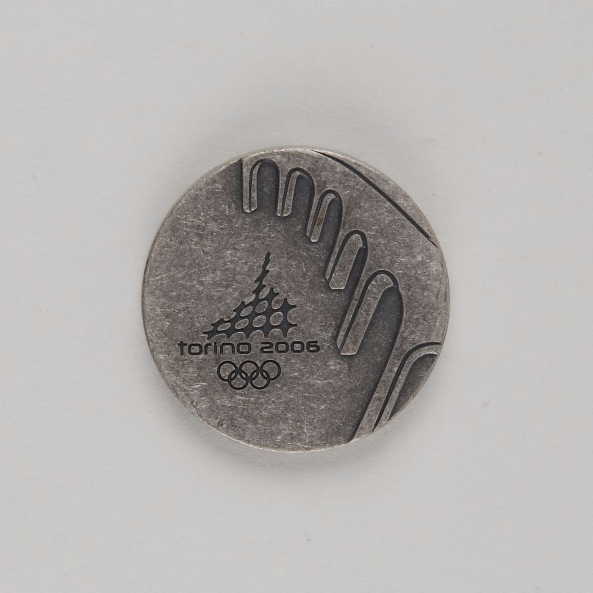 Participation medal issued for the Torino 2006 Winter Olympics. Pewter, 40 mm, 33 gm, by Quatrini. The front depicts the Torino Games emblem with the Aqueduct of Alpignano above; the reverse bears several rays of ice crystals and the Olympic rings and motto below. Complete with its original cardboard and plastic case.