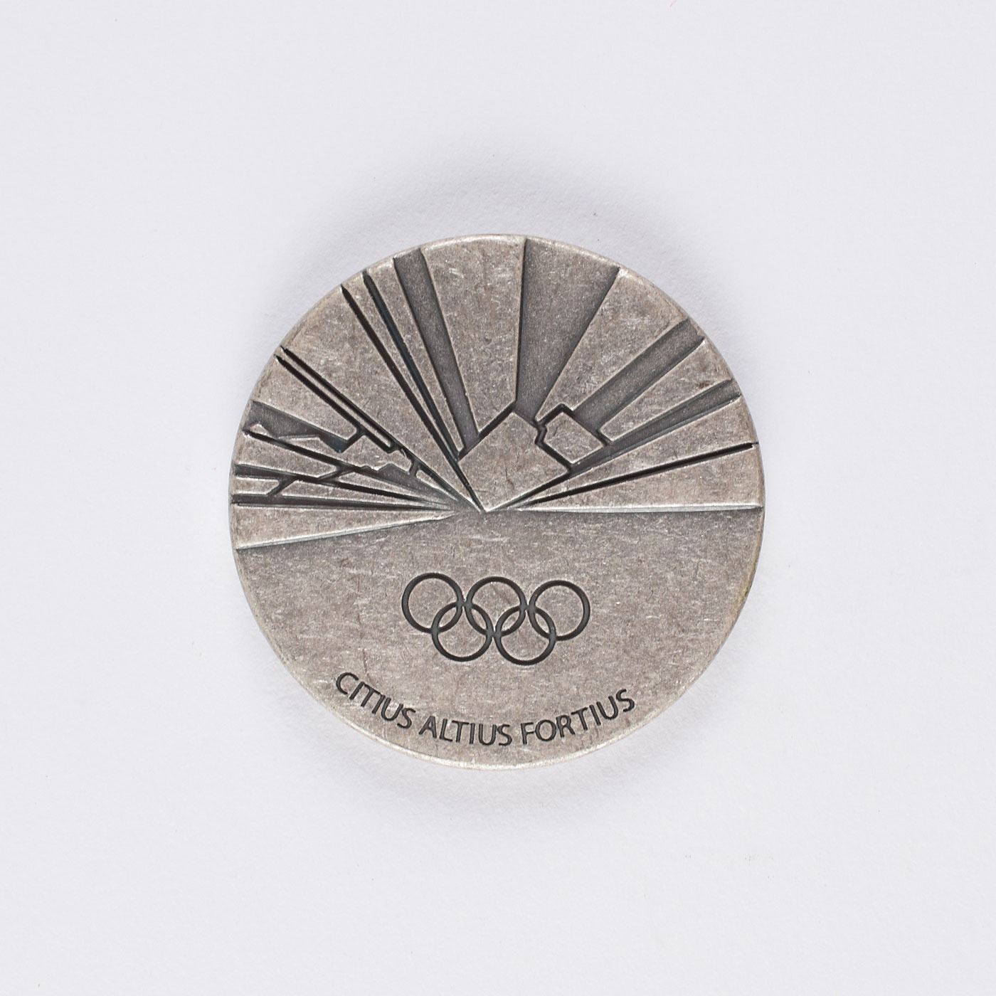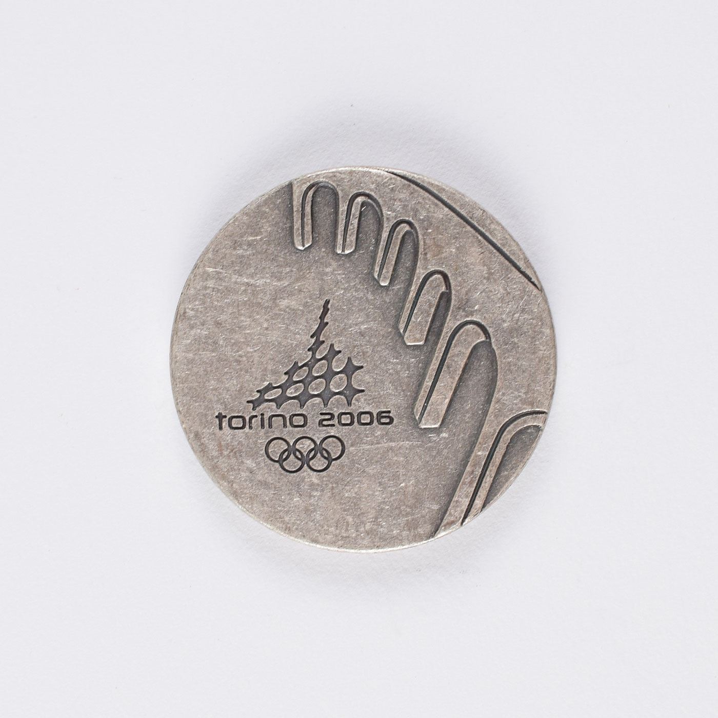 Participation medal issued for the Torino 2006 Winter Olympics. Pewter, 40 mm, 33 gm, by Quatrini. The front depicts the Torino Games emblem with the Aqueduct of Alpignano above; the reverse bears several rays of ice crystals and the Olympic rings and motto below. Complete with its original cardboard and plastic case.
