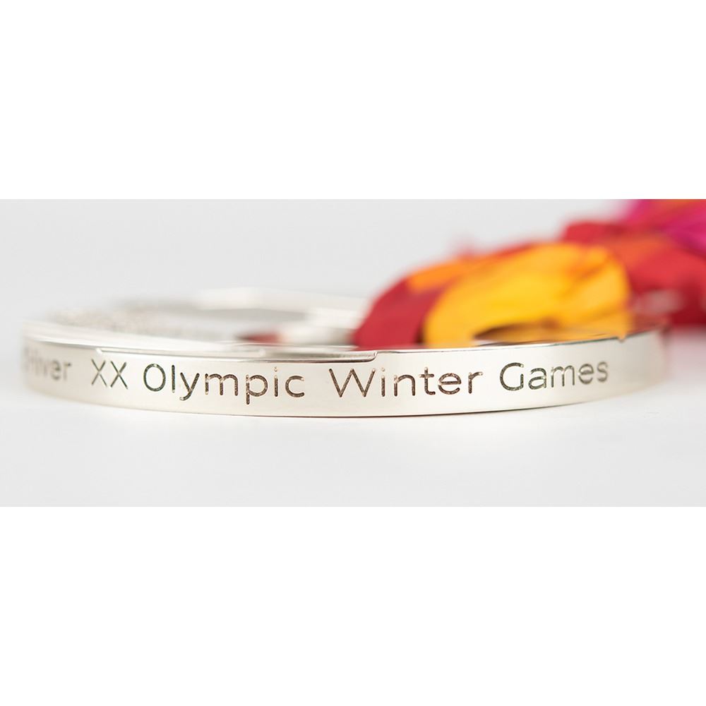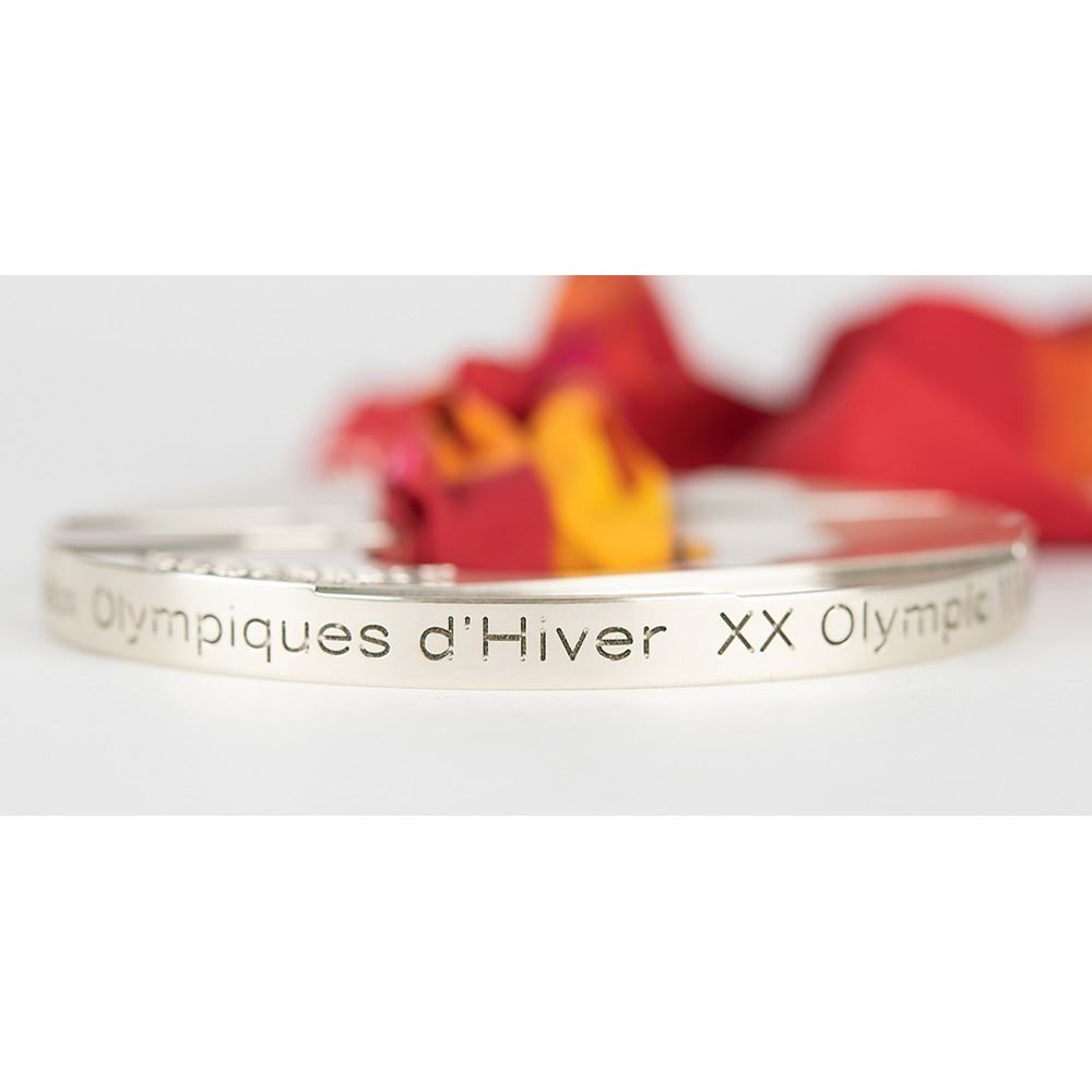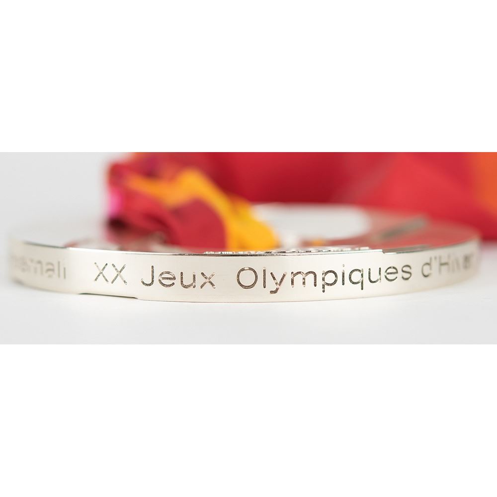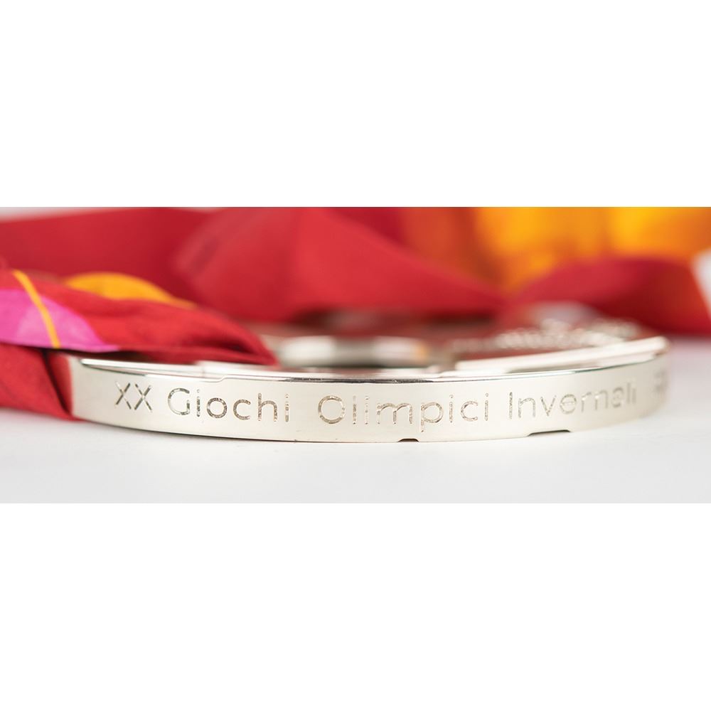 Stunning winner's medal from the Torino 2006 Winter Olympics. Silver, 470 gm, 108 mm, designed by Quatrini and minted by Ottaviani International. The front features a fluid geometric design of the emblem of the Games at the bottom; the reverse has a polished pictogram of the sport—figure skating—and is engraved with the event, "Mixed Ice Dancing." The edge is engraved in Italian, French, and English: "XX Giochi Olimpici Invernali, XX Jeux Olympiques d'Hiver, XX Olympic Winter Games." The uniquely designed medal has a hole at the center, through which the red, gold, and fuschia ribbon is tied. Complete with its original wood-and-plastic curved display case and cardboard box, which is creased. At the time, the Torino winner's medal was the largest ever issued.