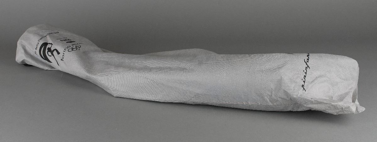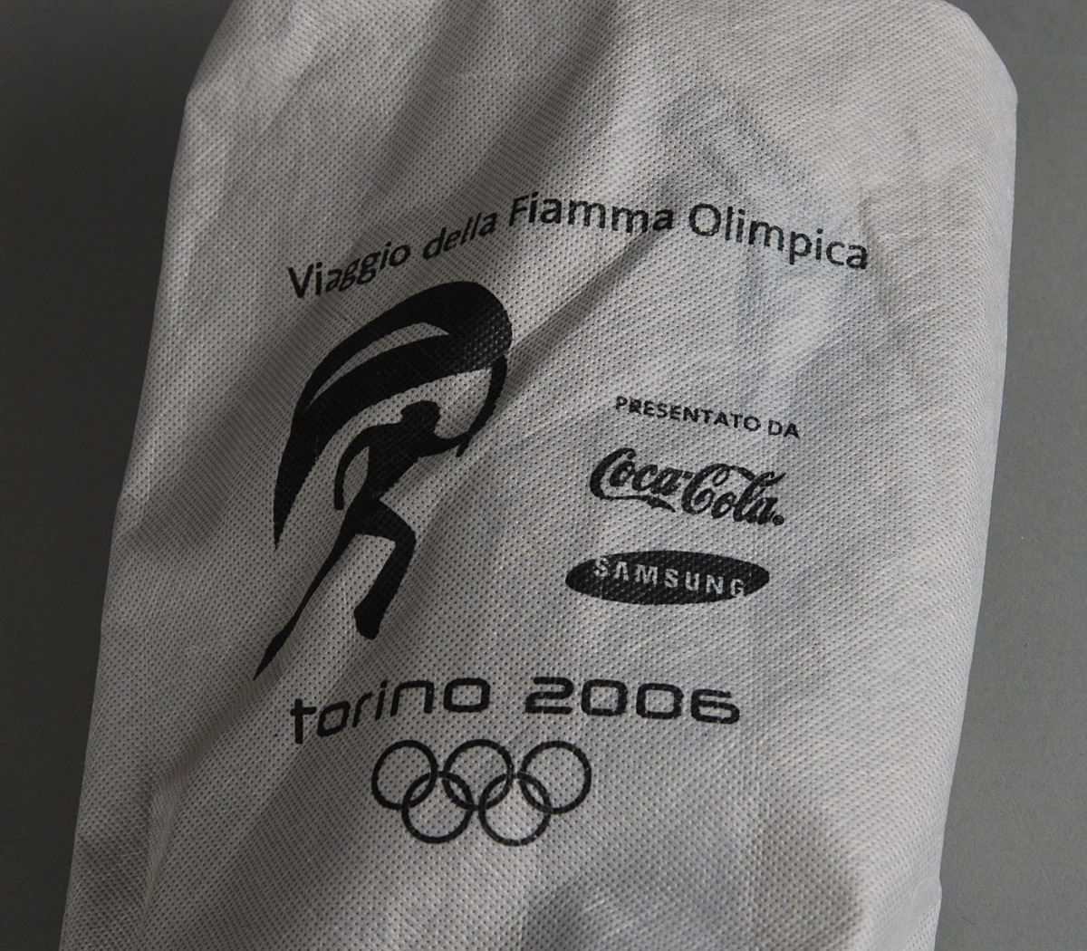 Official 2006 Torino Winter Olympics torch, constructed of blue techno–polymer–coated aluminum, measuring 31.25? in length and 4.5? at its widest point. Includes the original gray drawstring bag. Designed by Pininfarina, the shape of the torch was designed to appear like a ski tip, while also representing the monument and symbol of Turin, the Mole Antonelliana. Additionally, the design was intended to replicate the traditional wooden torch, giving the impression that the metal itself catches fire and burns. The middle portion of the torch bears an inscription of the Torino Games emblem with Olympic rings. Starting on December 8, 2005, the Olympic torch relay lasted 75 days and traversed over 11,300 km. In all, a total of 10,001 torchbearers carried the flame until it entered the Olympic Stadium on February 10, 2006. This sleek and dynamic Olympic torch was awarded the Lorenzo il Magnifico award, the highest prize from the Florence Biennale of Contemporary Art. Oversized.