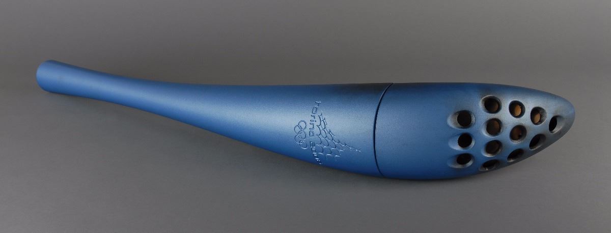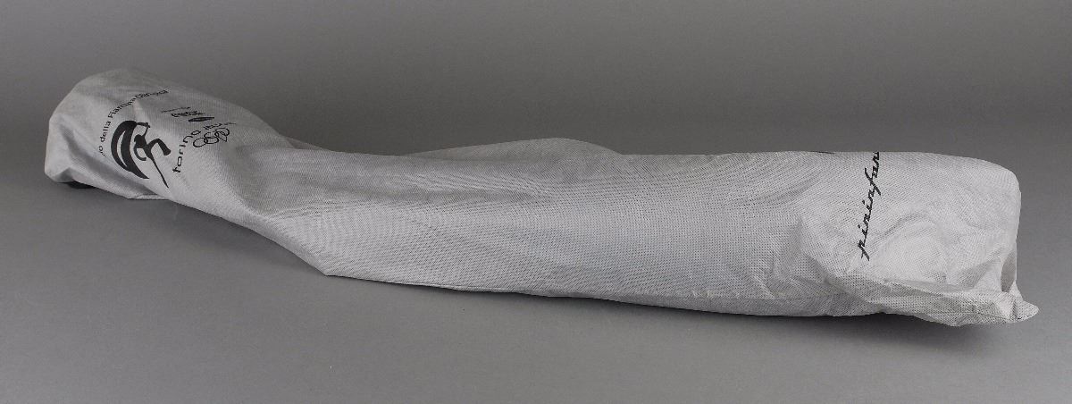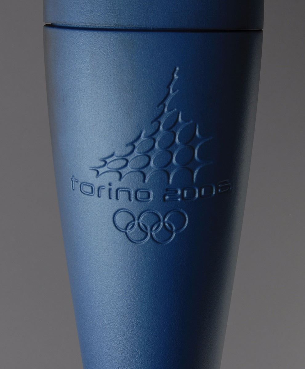 Official 2006 Torino Winter Olympics torch, constructed of blue techno–polymer–coated aluminum, measuring 31.25? in length and 4.5? at its widest point. Includes the original gray drawstring bag. Designed by Pininfarina, the shape of the torch was designed to appear like a ski tip, while also representing the monument and symbol of Turin, the Mole Antonelliana. Additionally, the design was intended to replicate the traditional wooden torch, giving the impression that the metal itself catches fire and burns. The middle portion of the torch bears an inscription of the Torino Games emblem with Olympic rings. Starting on December 8, 2005, the Olympic torch relay lasted 75 days and traversed over 11,300 km. In all, a total of 10,001 torchbearers carried the flame until it entered the Olympic Stadium on February 10, 2006. This sleek and dynamic Olympic torch was awarded the Lorenzo il Magnifico award, the highest prize from the Florence Biennale of Contemporary Art.