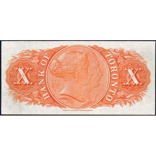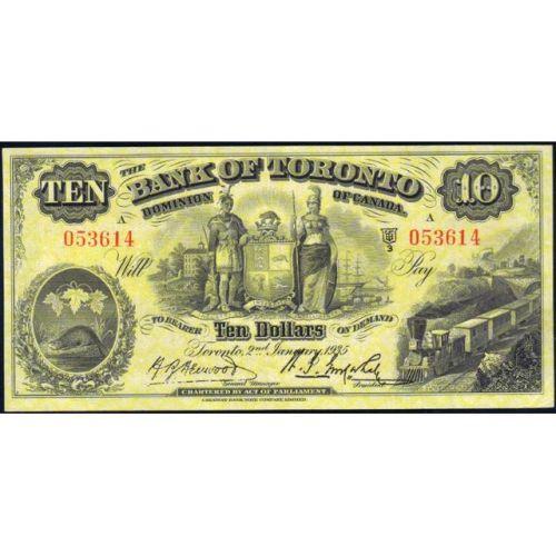 The Bank of Toronto Ten Dollars 1935, CH 715-24-08, Serial Number 053614 A, PMG AU-53. Slightly off centre toward the left and the top
