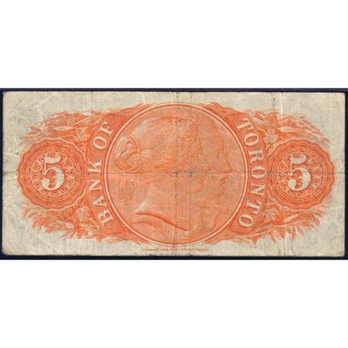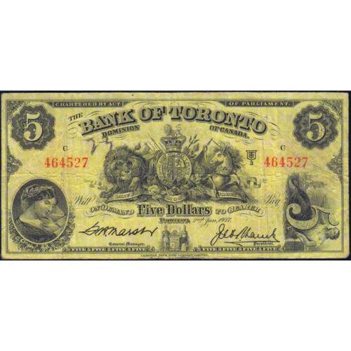 The Bank of Toronto Five Dollars 1937, Marsh-Lamb, CH 715-24-06 Serial Number 464527 C, PMG Very Fine 20. A small pinhole