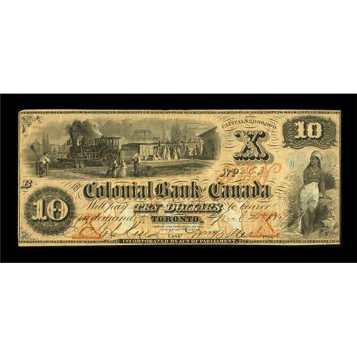 <B>Toronto, CW- The Colonial Bank of Canada</B></I> $10 Ch. # 130-10-02-12<BR> This short lived banking venture collapsed after a run within a few months of its opening in 1859. This piece, from the bank's first issue, has two signatures and an orange brown tint. <B>Very Fine.</B></I><BR><I>From The Thomas M. Flynn Collection</B></I><BR><BR><b>Shipping:</b> Coins & Currency (<a target="_blank" href="http://www.heritageauctions.com/common/shipping.php">view shipping information</a>)