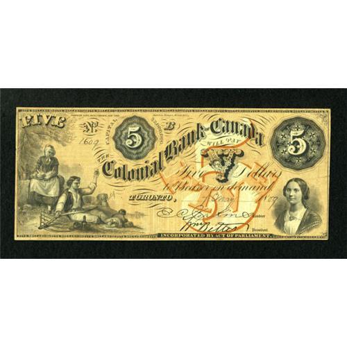 <B>Toronto, CW- The Colonial Bank of Canada</B></I> $5 May 7, 1859 Ch. # 130-10-02-10<BR> The paper on this note is quite crisp and the color vivid. <B>Very Fine</B></I>.<BR><BR><b>Shipping:</b> Coins & Currency (<a target="_blank" href="http://www.heritageauctions.com/common/shipping.php">view shipping information</a>)