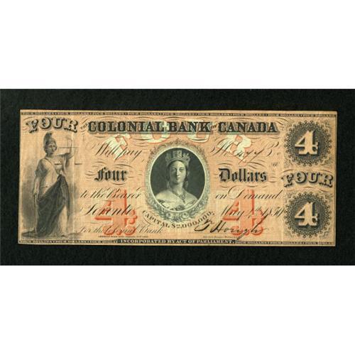 <B>Toronto, CW- The Colonial Bank of Canada</B></I> $4 May 4, 1859 Ch. # 130-10-04-08<BR> Bright inks are noticed on this crisp example. <B>Very Fine</B></I>.<BR><BR><b>Shipping:</b> Coins & Currency (<a target="_blank" href="http://www.heritageauctions.com/common/shipping.php">view shipping information</a>)