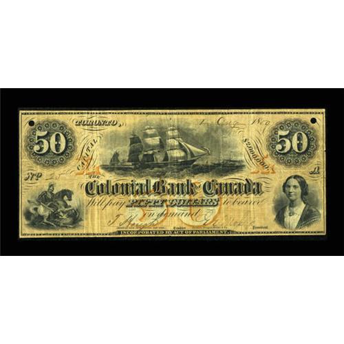 <B>Toronto, CW- The Colonial Bank of Canada</B></I> $50 Aug 4, 1859 Ch. # 130-10-02-16<BR> This completed note carries the all important authentic issued date of Aug. 4, 1859. There is a small punch cancel in each upper corner. <B>Fine</B></I>.<BR><BR><b>Shipping:</b> Coins & Currency (<a target="_blank" href="http://www.heritageauctions.com/common/shipping.php">view shipping information</a>)