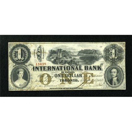 <B>Toronto, CW- The International Bank</B></I> $1 September 15, 1858 Ch. # 380-10-08-08<BR> A small amount of soiling is noticed as well as some small internal tears. <B>Fine-Very Fine</B></I>.<BR><BR><b>Shipping:</b> Coins & Currency (<a target="_blank" href="http://www.heritageauctions.com/common/shipping.php">view shipping information</a>)