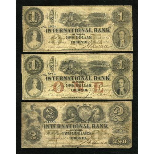 <B>Toronto, CW- The International Bank</B></I><BR>$1 September 15, 1858 Ch. # 380-10-08-06<BR>$1 September 15, 1858 Ch. # 380-10-10-08<BR>$2 September 15, 1858 Ch. # 380-10-08-10<BR> A trio of notes from this prolific issuer that grades <B>G/VG</B></I> with problems such as tears and paper skins.<BR><BR><b>Shipping:</b> Coins & Currency (<a target="_blank" href="http://www.heritageauctions.com/common/shipping.php">view shipping information</a>)