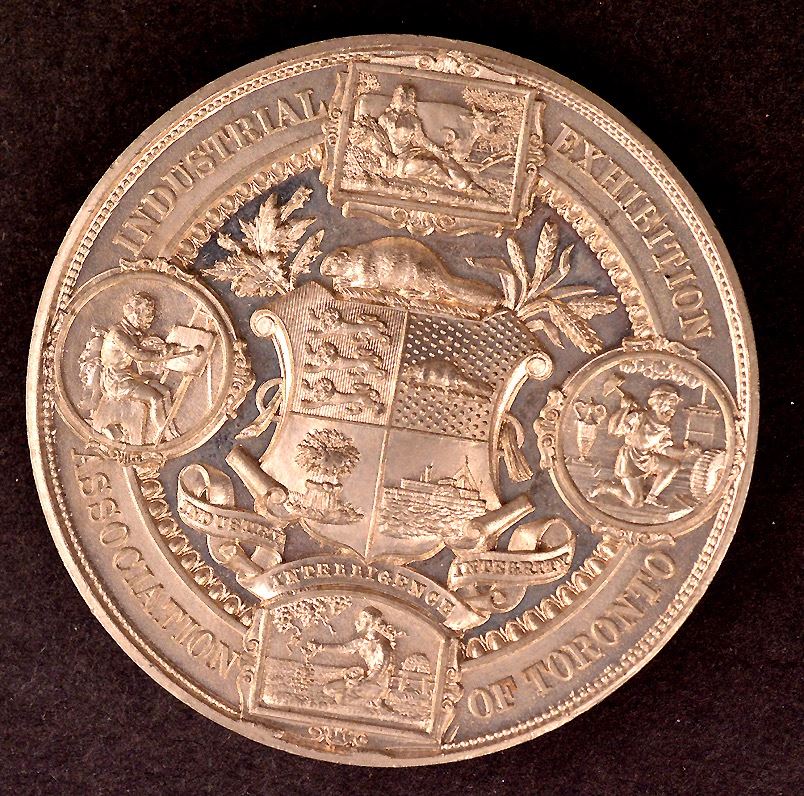 Industrial Exhibition Association of Toronto, large medal, by P.W. Ellis & Co., Toronto, Wm, 64mm, 8mm thick, 137.4 gms. CH#EONA-72, According to Charlton, the White Metal strikes were likely trial strikes and salesman's samples. Nice EF. Scarce.