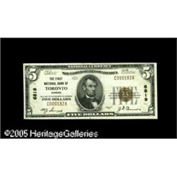 <B>Toronto, KS</B></I> - $5 1929 Ty. 1 <B>The First NB</B></I> Ch. # 6819<BR>A bright and crisp <B>Very Fine-Extremely Fine</B></I> from this town's only National Bank. This example is the highest grade known of the four $5 1929 Type 1 pieces traced from here to date. Lot:16878