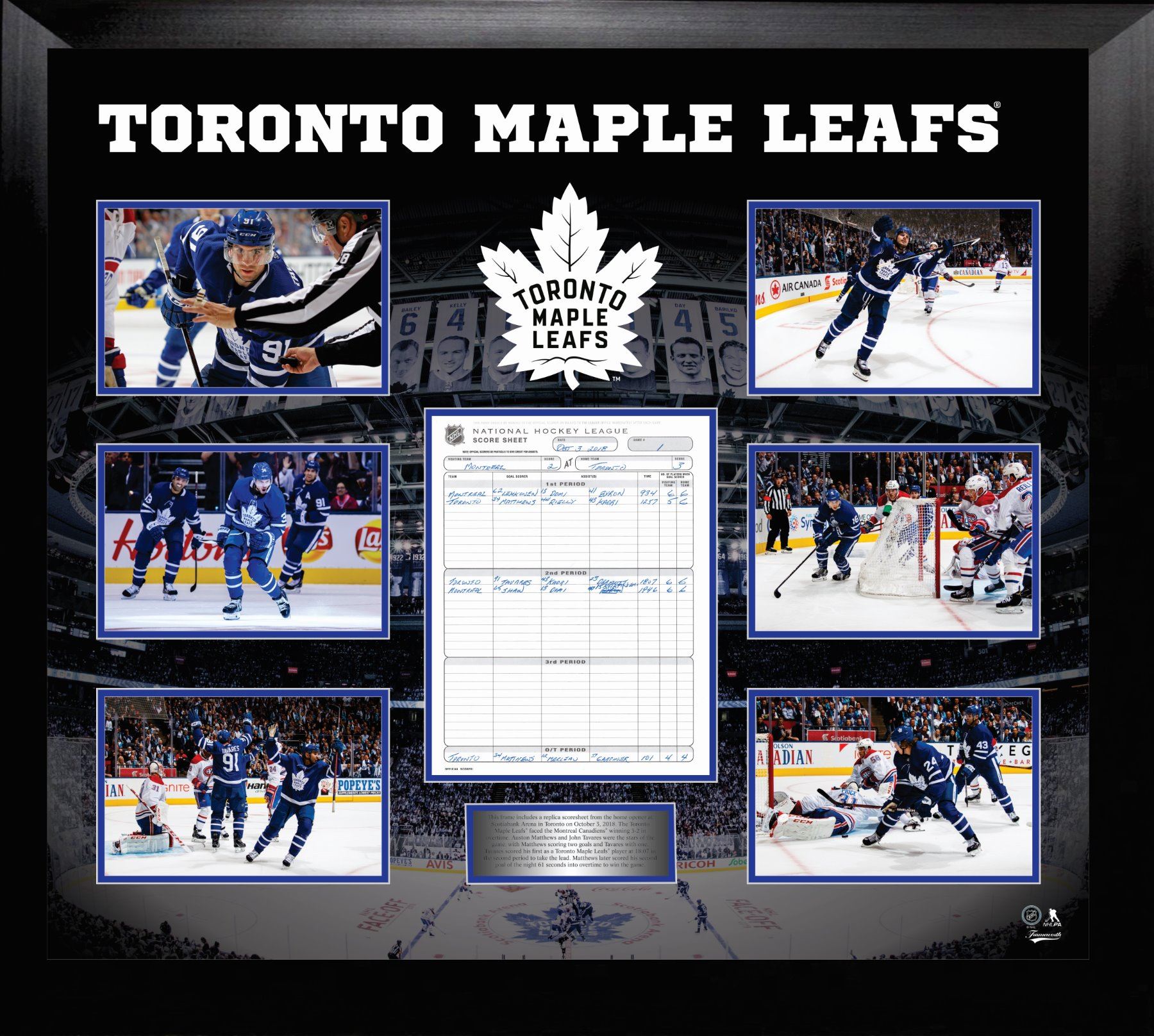 This frame includes a replica scoresheet from the home opener at Scotiabank Arena on October 3, 2018. Toronto beat Montreal 3-2, with Auston Matthews scoring two goals and John Tavares with one. This piece features a replica of the scoresheet for this game. NHL licensed. 35 3/8" W by 31 5/16" H