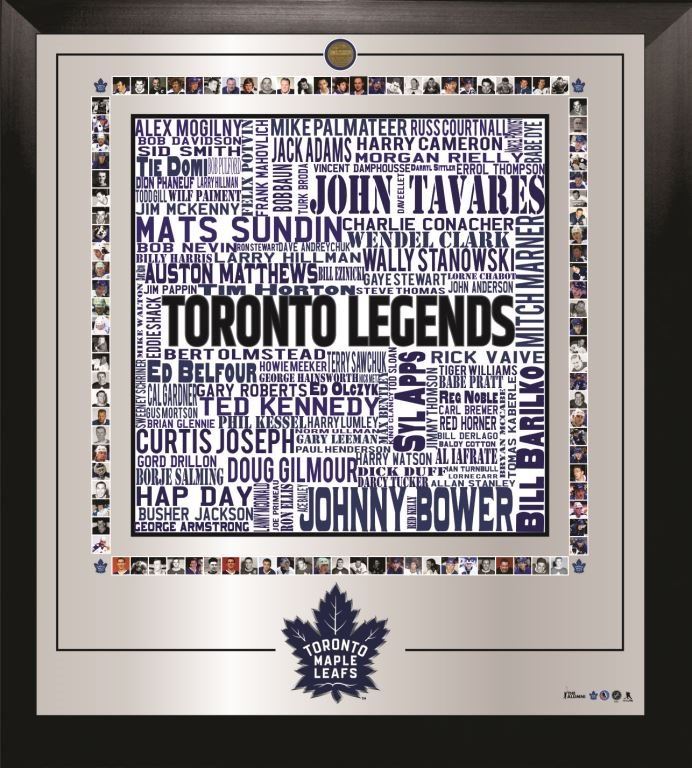 This piece is a word collage of Toronto Maple Leaf legends, past and current. Dimensions are 35.25" H by 27.25" W